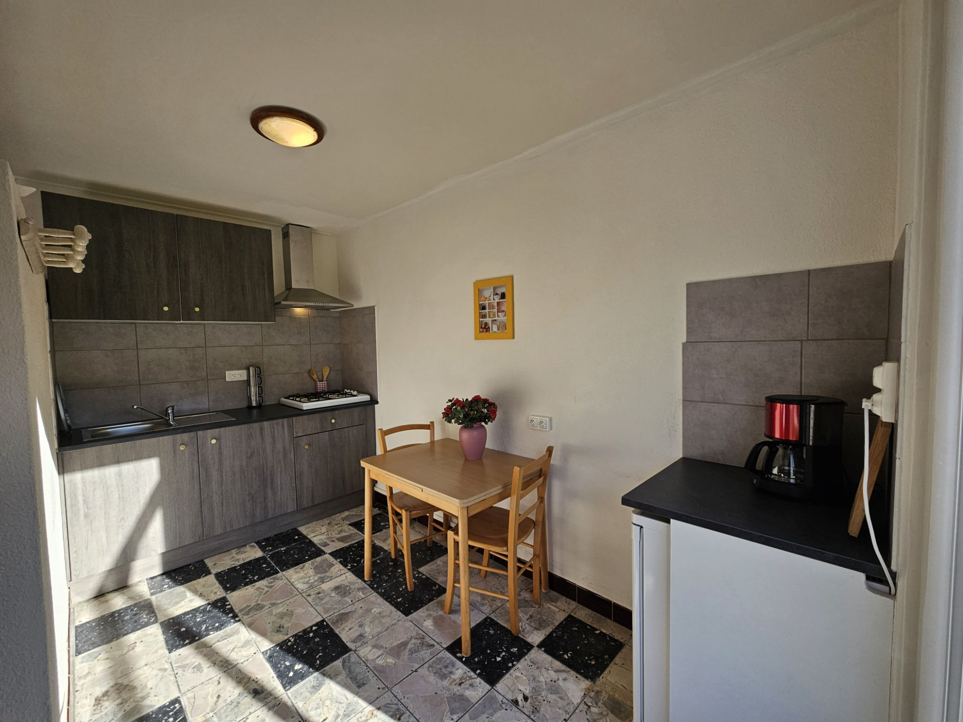 Vous disposez d’un grand lit 2 place (1.60mx2.00m) et d’un lit simple (0.90mx2.00m). La salle de bain est spacieuse et lumineuse équiper d’une douche à l’italienne. Le studio a un kitchenette toute équiper : réfrigérateur, plaque de cuissons, mini four, machine à café, bouilloire et une table ou vous pourrais manger.